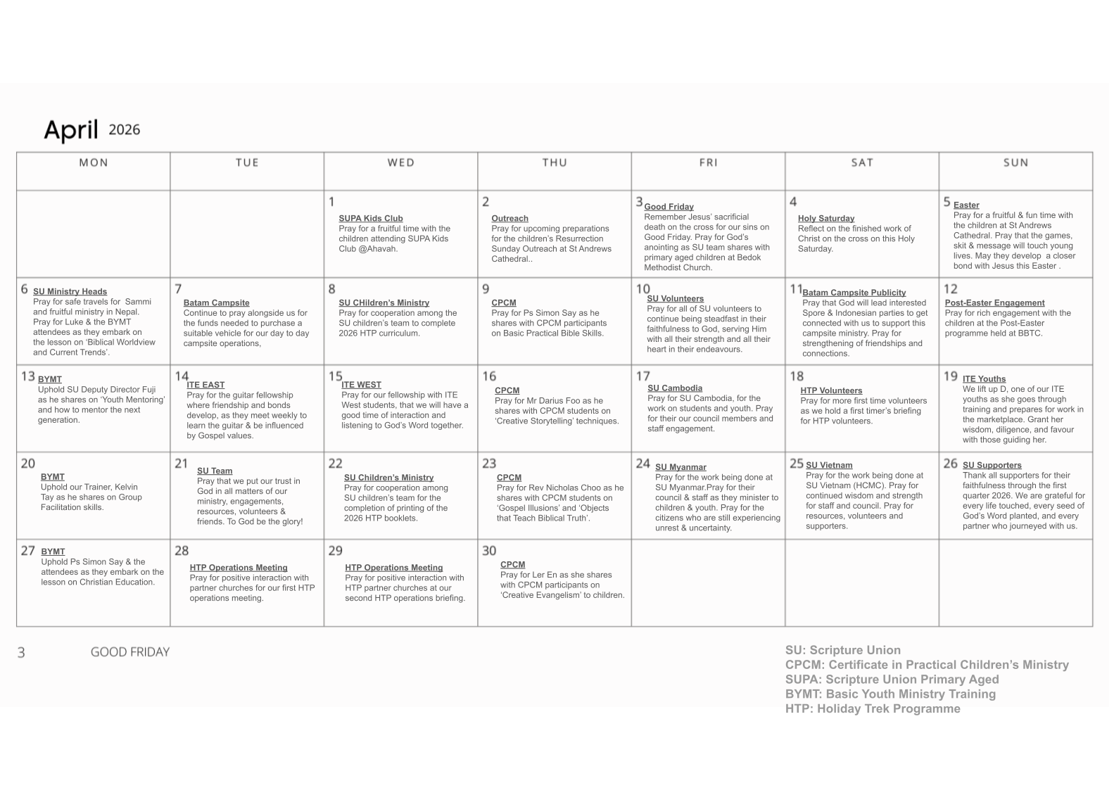 ​Email your name and contact number to admin@scriptureunion.sg or call 63371437 to get an update on our latest volunteering opportunities!